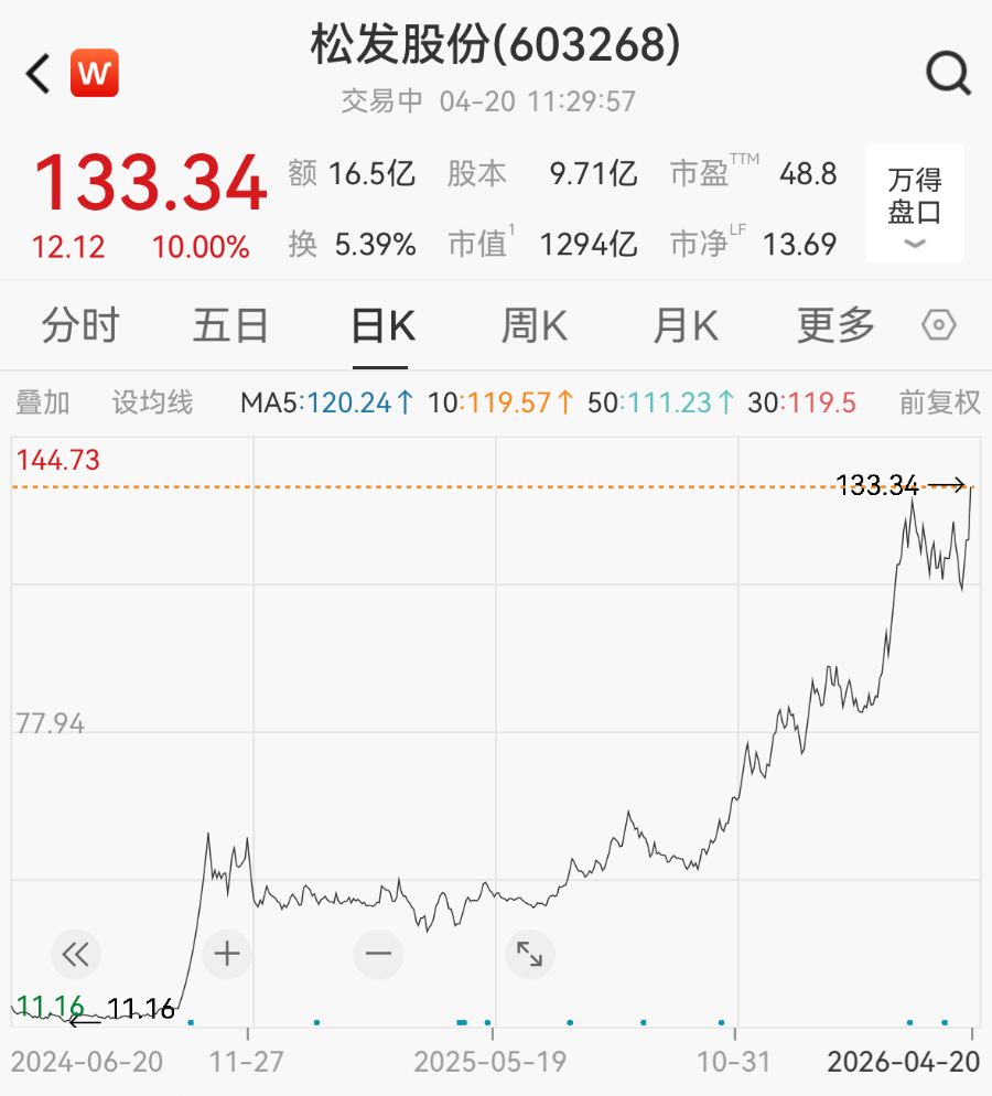 4月20日,松发股份(603268.SH)直线拉涨停。截至午间收盘,报133.34元/股,总市值逼近1300亿元。