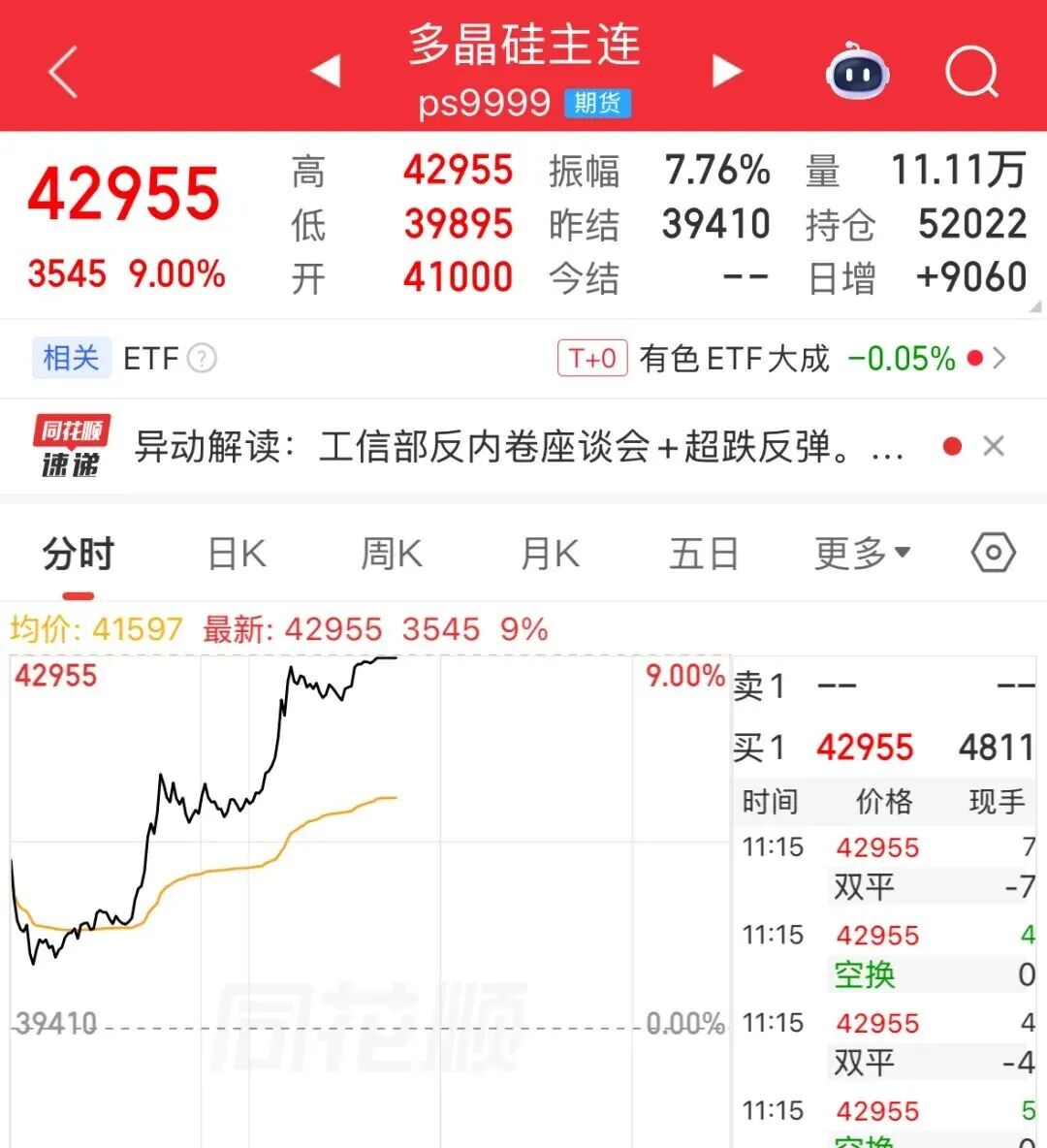商品方面,多晶硅期货主力合约涨停,报42955元/吨,涨幅9%。