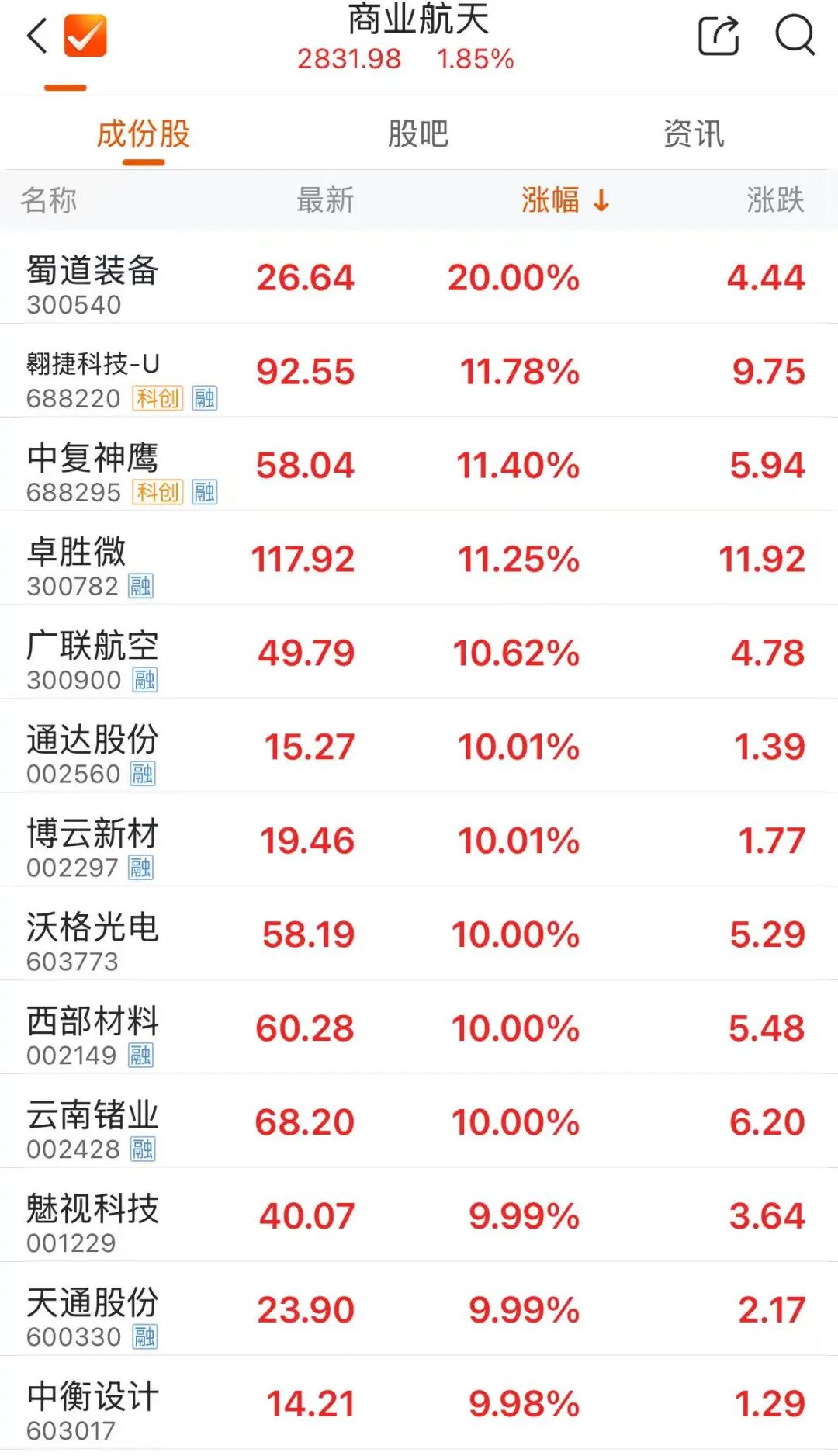早盘,商业航天概念持续走高。蜀道装备“20cm”涨停,西部材料、中衡设计、魅视科技等多股涨停, 中国卫星触及涨停, 神剑股份一度冲高逼近涨停, 广联航空、中复神鹰等涨幅靠前。