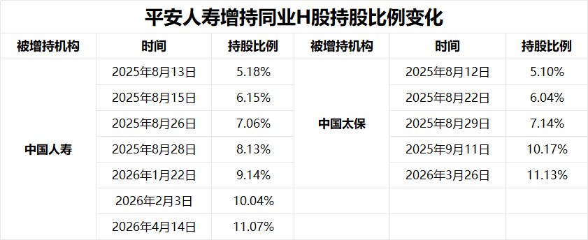 根据港交所披露的数据,平安人寿自2025年8月首次举牌中国人寿H股、中国太保H股以来,已多次增持,持股比例均提升至10%以上。