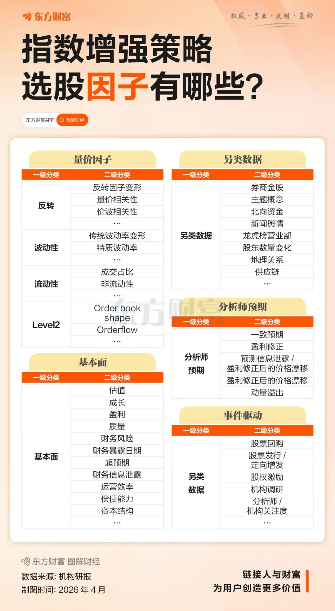 因子类型包括但不限于量价因子、另类数据因子、基本面因子、事件驱动因子和分析师预测因子等,并对因子做清洗、加权等操作,最终生成对于个股的 “综合得分”,在指数成分股中,超配打分高的个股、低配打分低的个股,形成增强组合。