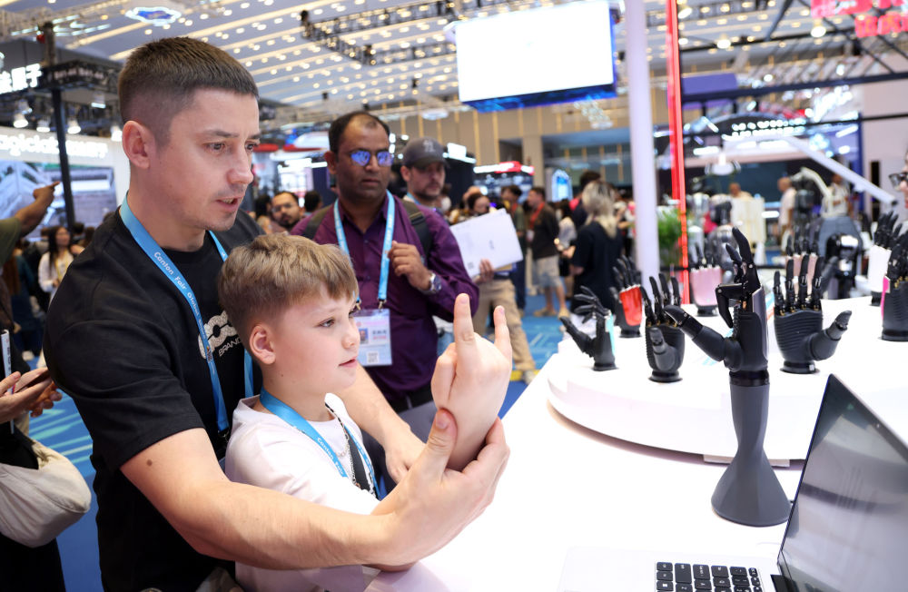 在第139届中国进出口商品交易会(广交会)的服务机器人专区,境外采购商带着孩子和灵巧手互动。记者 卢汉欣 摄