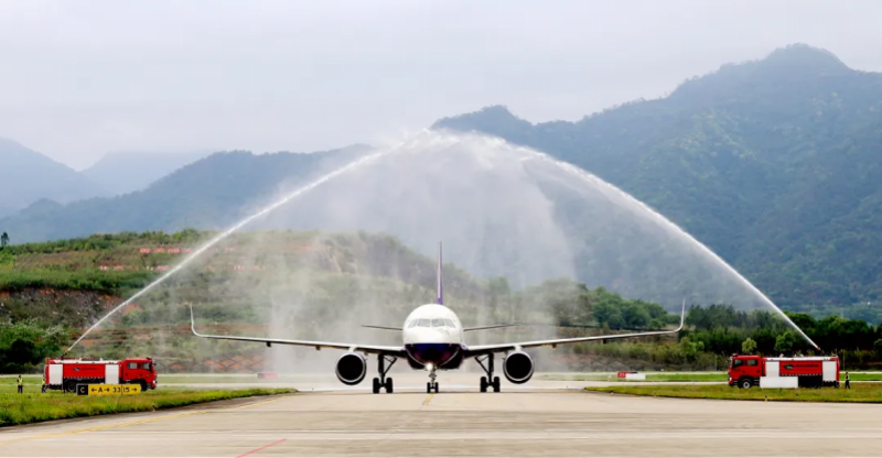 韶关丹霞机场以民航最高礼遇“过水门”仪式,迎接一架载有180余名云南游客的A320航班平稳降落——“万人包机游韶关”首航团顺利抵达。来源:韶关市文化广电旅游体育局