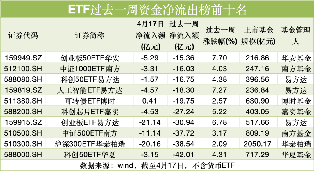资金净流出方面,宽基ETF成为“失血”大本营,包括科创50ETF华夏、沪深300ETF华泰柏瑞、中证500ETF南方、创业板ETF易方达在内的4只宽基ETF上周资金净流出均超30亿元。