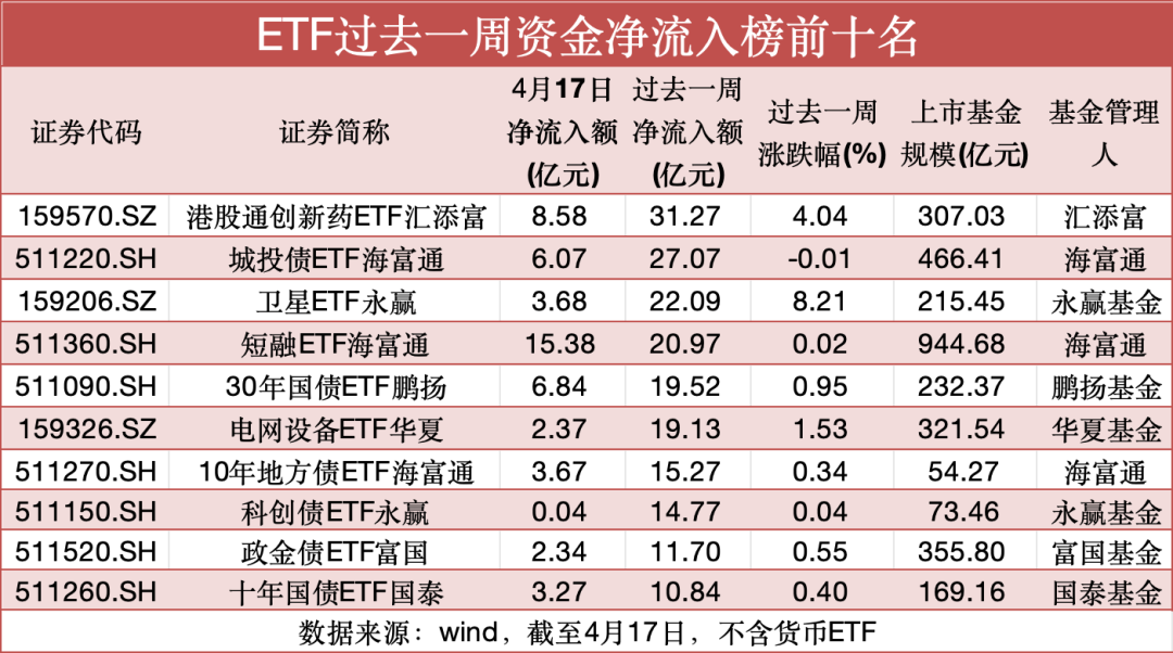 在资金流动性宽裕以及机构配置需求推动下,包括城投债ETF海富通、短融ETF海富通、30年国债ETF鹏扬、10年地方债ETF海富通、科创债ETF永赢、政金债ETF富国、十年国债ETF国泰在内的多只债券ETF跻身非货ETF单周净流入榜前十名。