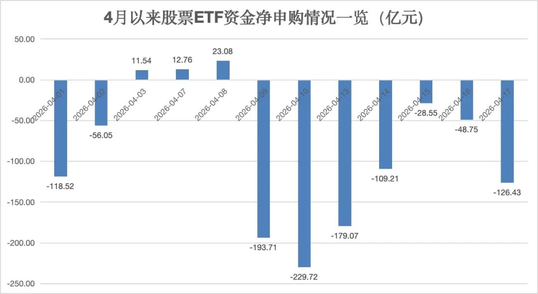 据银河证券基金研究中心数据统计,4月17日(上周五)全市场股票ETF资金净流出超百亿元,上周的五个交易日均呈现净流出。这也是自2月13日以来,股票ETF市场单周连续五个交易日出现净流出的局面。
