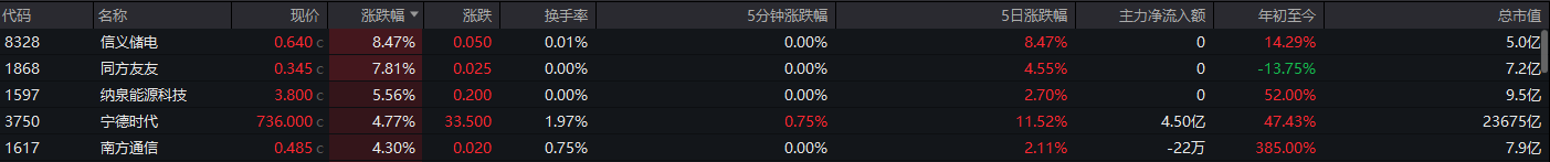 电气设备板块上涨,信义储电、同方友友、纳泉能源科技涨幅领先。