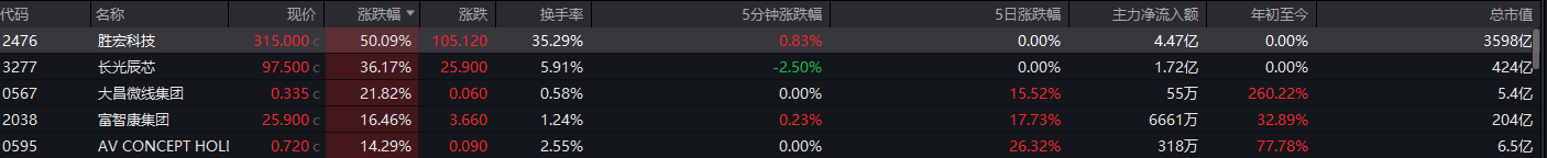 硬件设备板块大涨,胜宏科技涨超50%,长光辰芯涨超36%。