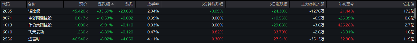 软件服务板块下跌,诺比侃、中彩网通控股跌幅居前。