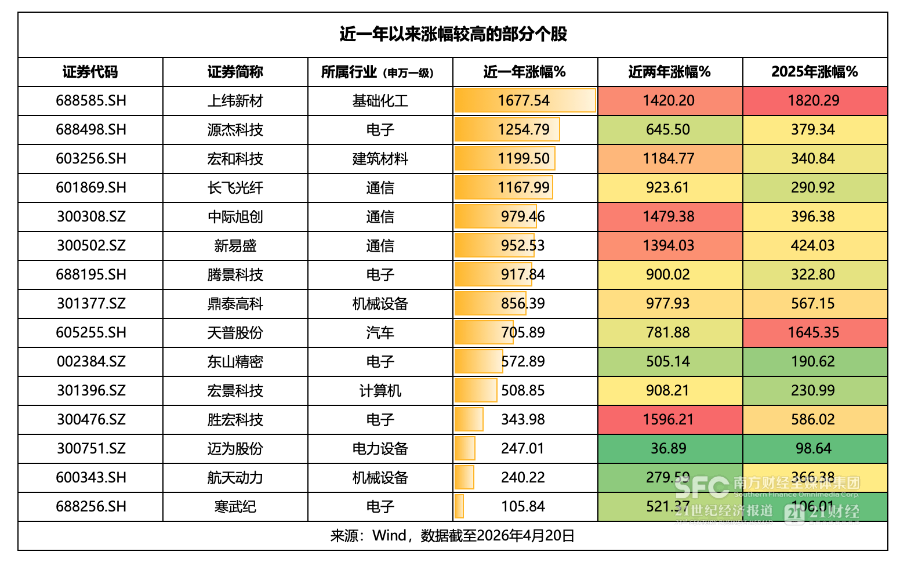 自2025年初以来,A股“科技牛”行情已催生出多只十倍股。21世纪经济报道记者据Wind不完全统计,截至今年4月20日,近一年涨幅超10倍的个股有上纬新材、源杰科技、宏和科技,以及长飞光纤等。此外,热门股新易盛、中际旭创自2023年初以来的累计涨幅分别超过47倍和43倍,胜宏科技、寒武纪也分别超过26倍、24倍。