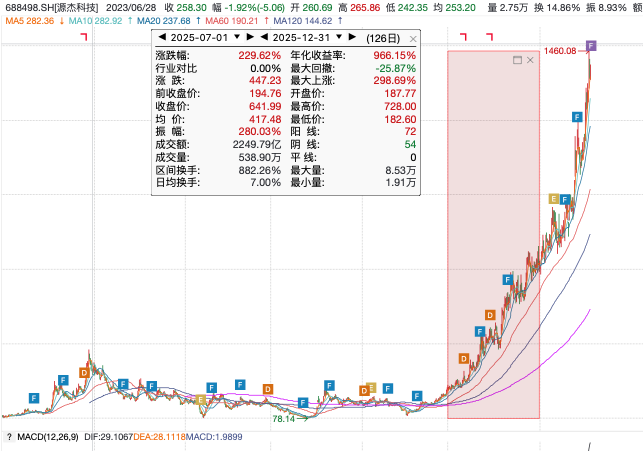源杰科技近一年以来股价涨幅超12倍。今年3月,源杰科技股价一举突破千元关口,随后短短一个月内直线拉升,上演现象级行情,短暂登顶A股“股王”。