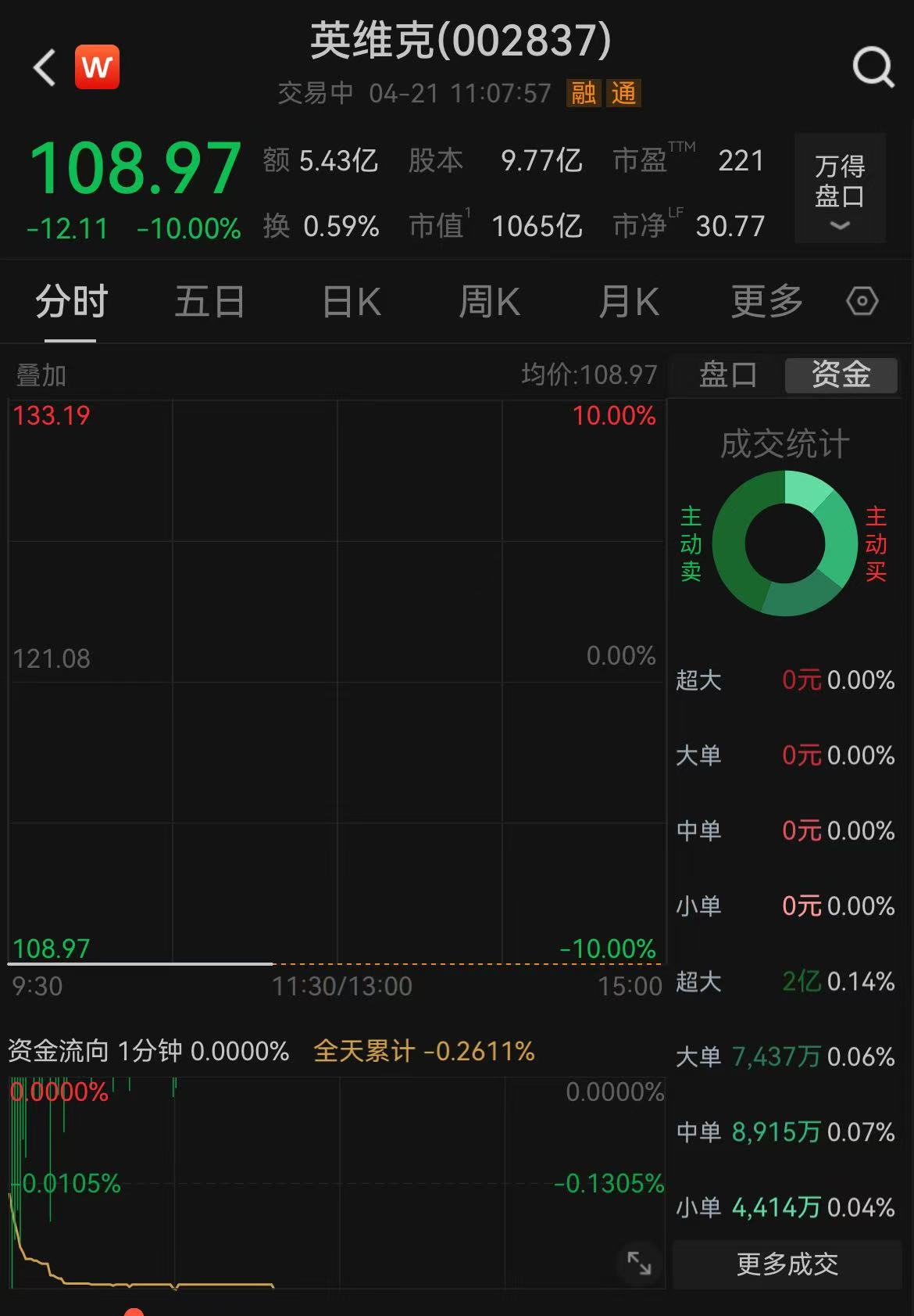 4月21日,液冷龙头英维克股价一字跌停,报108.97元/股,总市值1065亿元。而在前一天交易日,该公司创出历史新高,盘中一度涨停,收盘大涨9.41%,总市值为1183亿元。