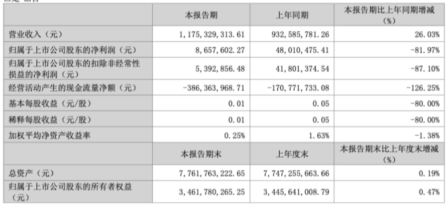 一季报显示,今年一季度公司实现营业收入11.75亿元,同比增长26.03%;归属于上市公司股东的净利润为865.76万元,同比下降81.97%;扣非净利润仅为539.29万元,同比下滑幅度高达87.10%。