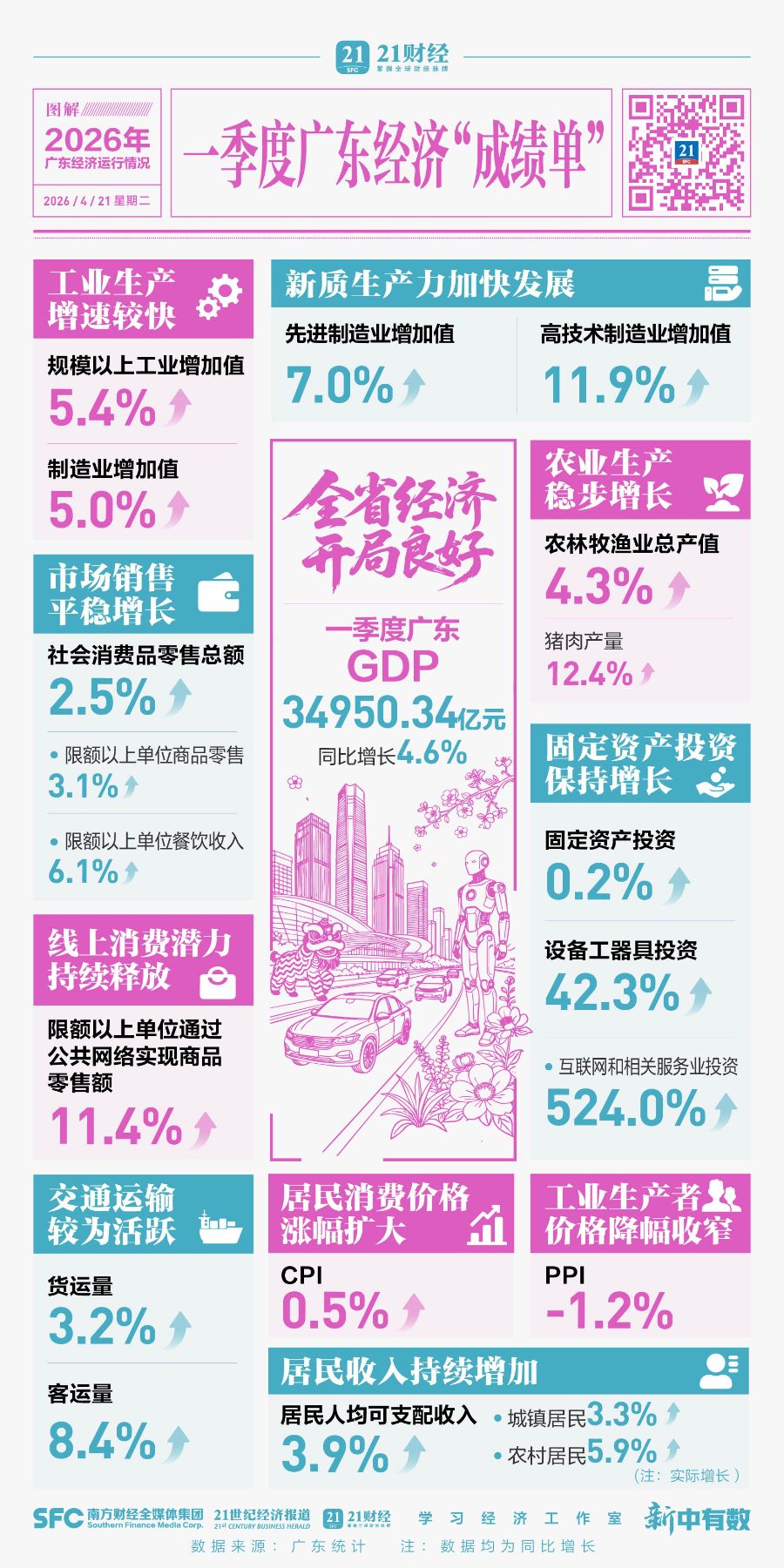 4月21日,广东省统计局公布一季度经济运行简况。数据显示,今年以来,广东主要宏观指标增速回升,经济运行总体延续回升向好态势,开局良好。