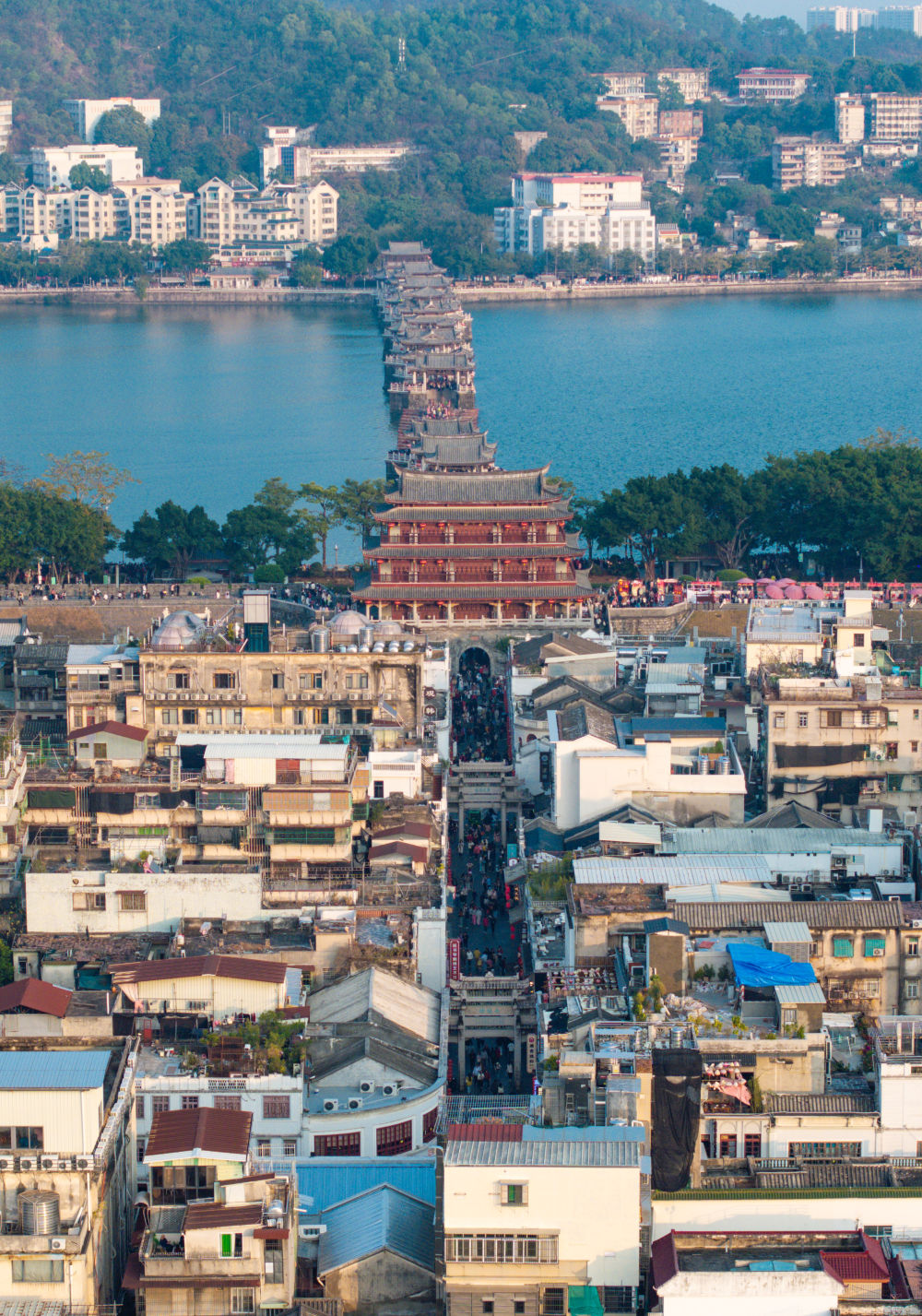 图为潮州广济桥、广济楼和潮州古城(无人机照片)。新华社记者 毛思倩 摄