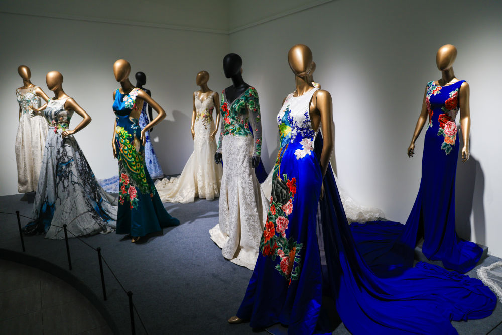 在广东潮州潮绣艺术馆内展示的带有潮绣元素的现代婚纱礼服。新华社记者 毛思倩 摄