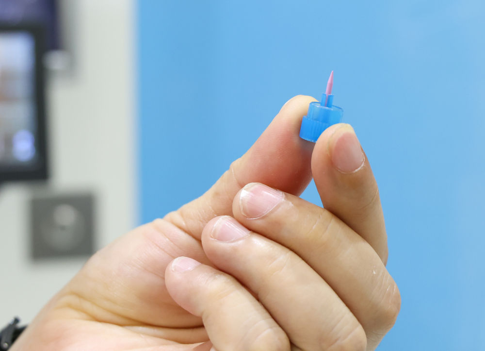 潮州三环(集团)股份有限公司员工展示IC封装陶瓷劈刀。新华社记者 毛思倩 摄