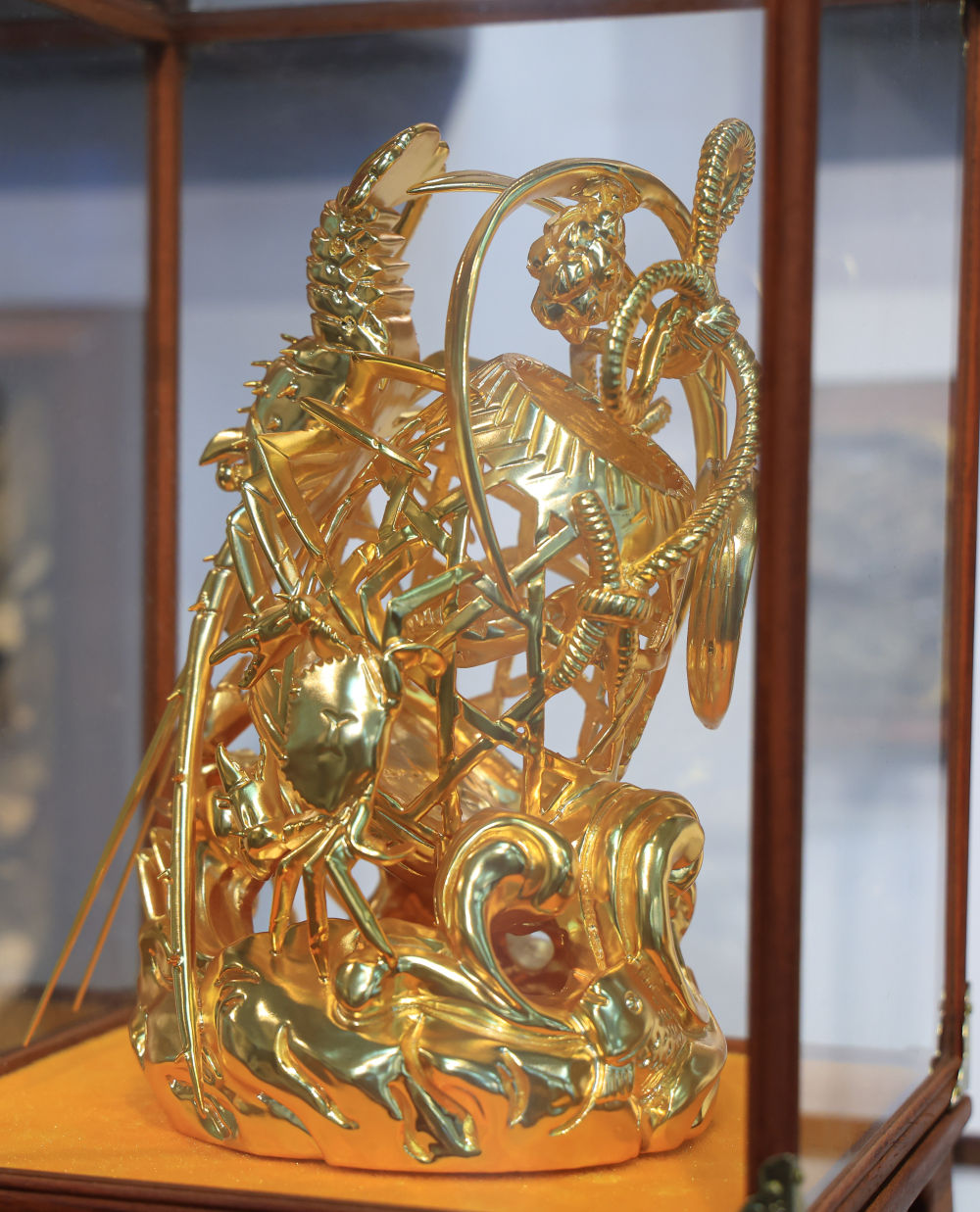 图为龙虾蟹篓题材的金漆木雕。新华社记者 毛思倩 摄