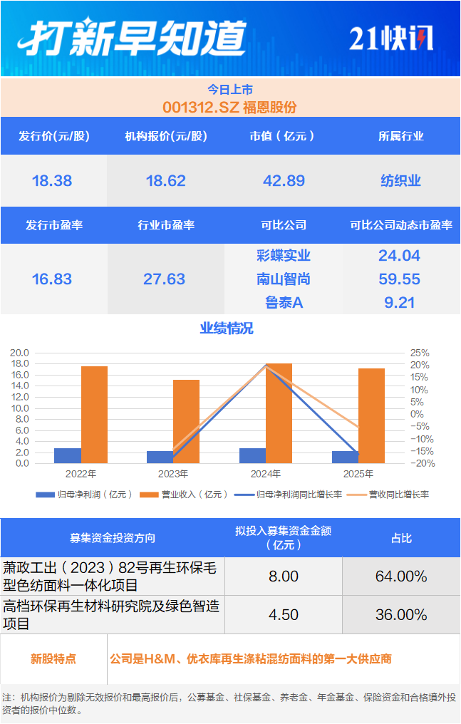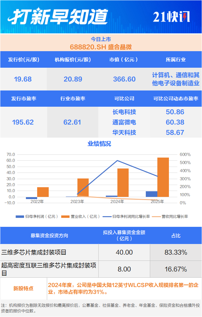 4月21日,有两只新股上市,分别是主板的福恩股份(001312.SZ),以及科创板的盛合晶微(688820.SH)。