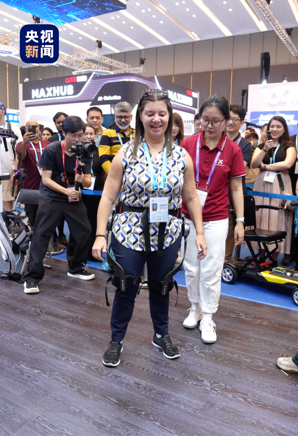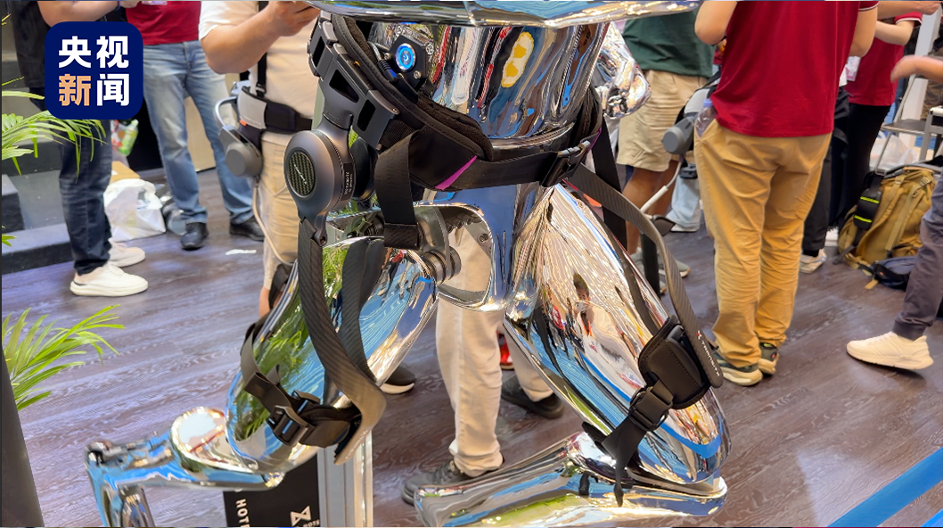 在一家外骨骼机器人展位旁排队
