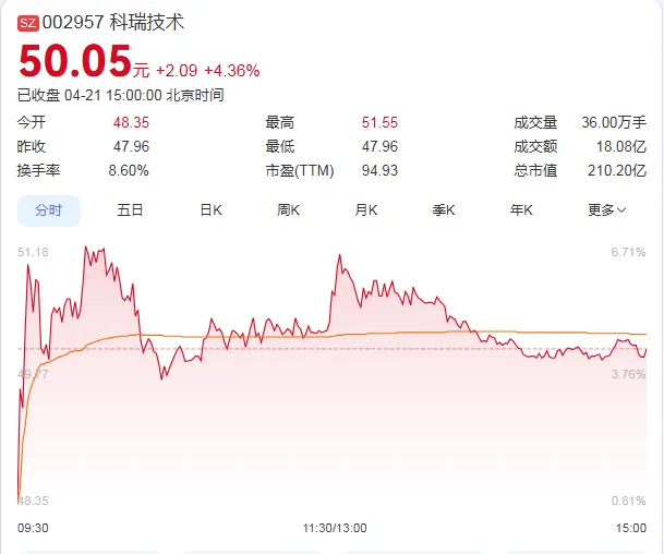 4月21日,科瑞技术股价大涨4.36%,收盘价为50.05元,成交额为18.08亿元,总市值攀升至210.20亿元。值得一提的是,自2026年3月24日以来的20个交易日内,科瑞技术股价累计涨幅高达109%,表现非常亮眼。