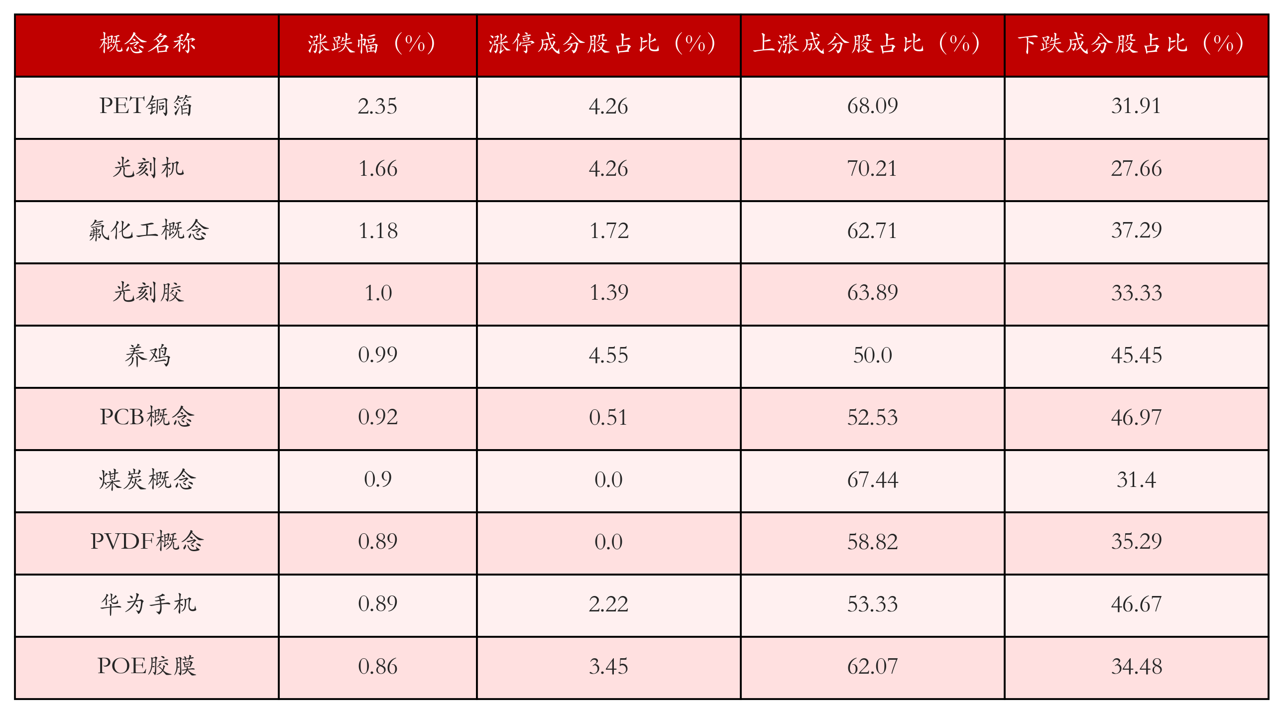 根据A股概念涨跌幅与所对应的股票池综合分析,涨幅靠前的三个概念板块分别为:PET铜箔、光刻机与氟化工概念。排名前10位的概念板块相关数据见下表: