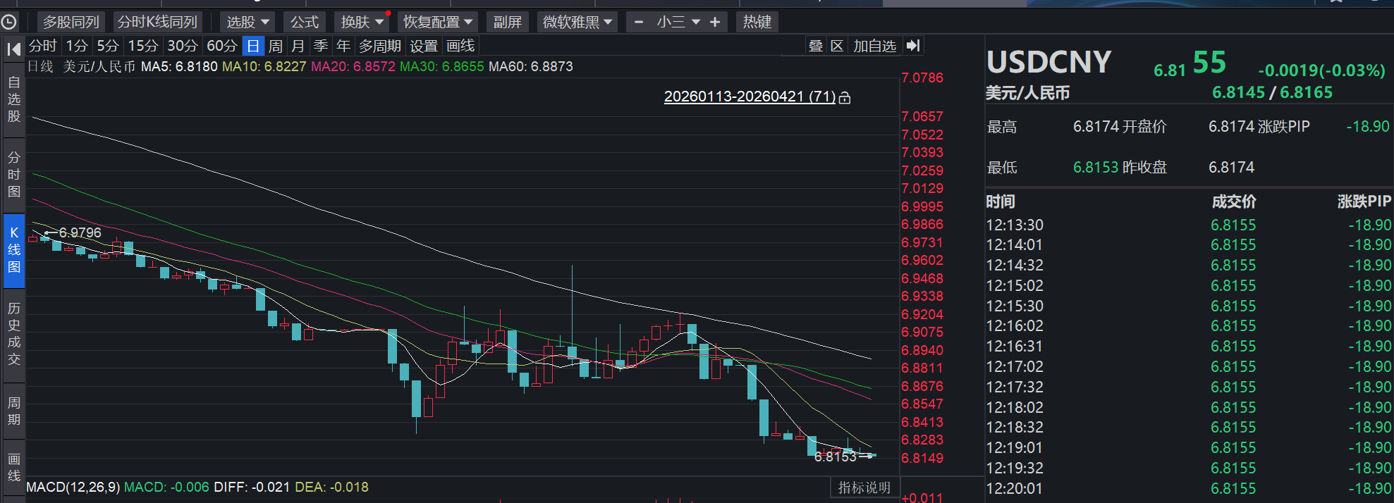 4月21日,美元指数进一步走弱,最低触及98.06点,考验98点的有效支撑。非美货币也出现强势反弹,人民币对美元在岸价、离岸价双双走高,离岸价一度触及6.81264,在岸价则是达到6.8153,在岸价站上年内新高,也创下2023年3月23日以来新高。当日,人民币对美元中间价较上日上调54点, 报6.8594。