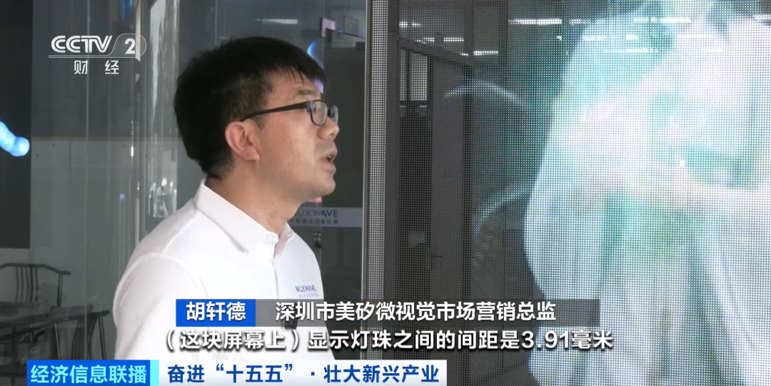 深圳市美矽微视觉市场营销总监 胡轩德:这块屏幕上显示灯珠之间的间距是3.91毫米,感官透明度测试达到了92%到97%,应用在商业空间当中,既有一个高清高亮的显示画面,同时又不遮挡从外往里的采光。