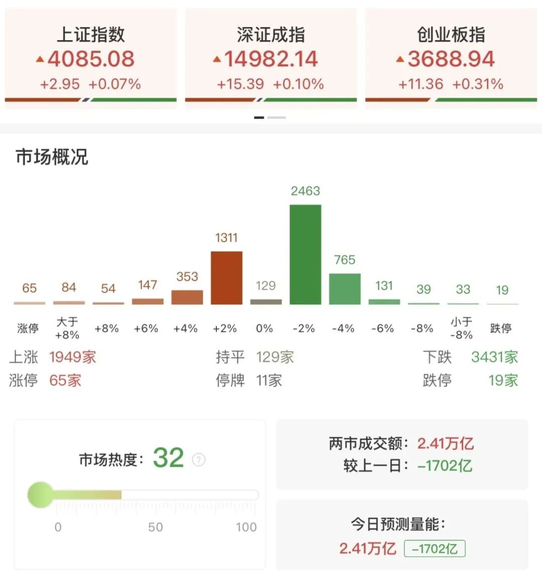 今日A股市场探底回升,三大指数集体收红,创业板指此前一度跌超1.5%。沪深两市成交额2.41万亿,较上一个交易日缩量1702亿。