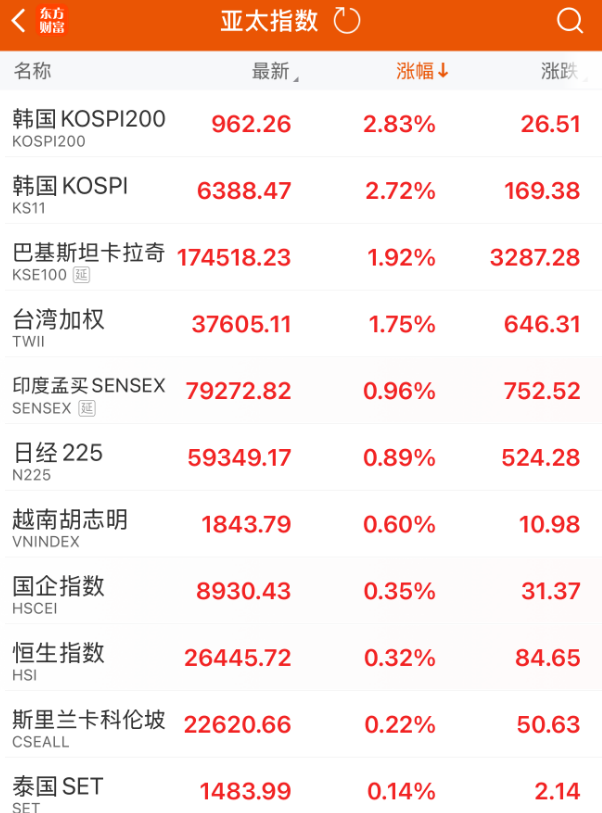 韩国KOSPI指数上涨2.7%,报6388.47点,创历史新高。此前一个交易日,这一以科技股为主的指数已经收复了中东冲突带来的全部跌幅。三星电子 和 SK海力士 领涨大盘。