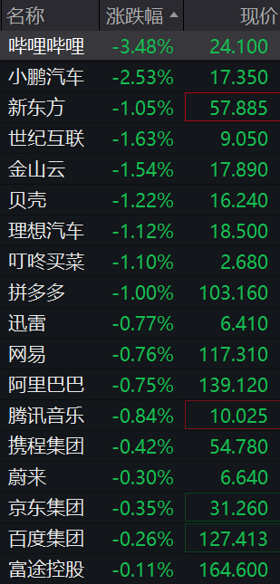 热门中概股集体下跌,哔哩哔哩跌超3%,小鹏汽车跌超2%,新东方、金山云、贝壳跌超1%,阿里巴巴、百度集团、京东集团、网易等均走低。