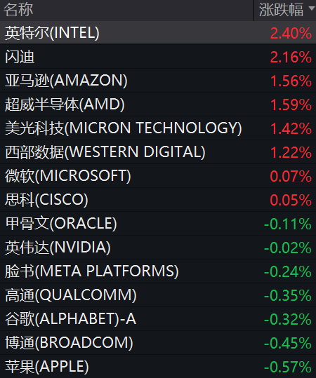 科技股涨跌不一,英特尔、闪迪涨超2%, 亚马逊、超威半导体涨超1%; 苹果、博通、奈飞等股价下跌。