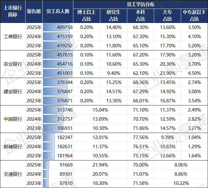 近日,上市银行2025年度报告陆续出炉,员工总数及学历分布再度成为观察银行经营转型的重要窗口。梳理国有六大行和主要股份制银行数据可以看到,过去三年间,研究生及以上学历员工占比整体提升,大专及以下学历员工占比普遍下降,银行业人才结构正加快向高学历、专业化方向演进。