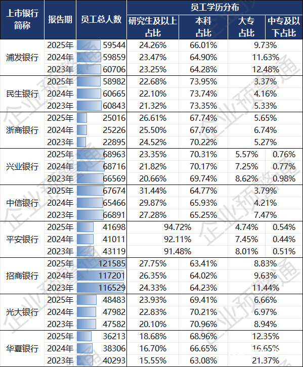 招商银行在股份行中规模最大,2025年员工总人数超过12万人,不过其研究生及以上员工占比2025年达27.75%,较2023年增长3.42%,位居股份行前列,研究生员工人数最多。