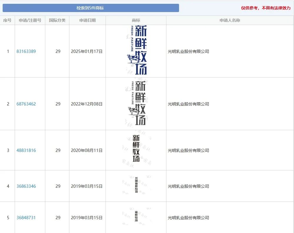 据国家知识产权局商标局网站,光明乳业股份有限公司曾多次申请“新鲜牧场”商标,但被驳回或不予受理后,因此,“新鲜牧场”并不是有效注册商标,仅以TM标识使用。