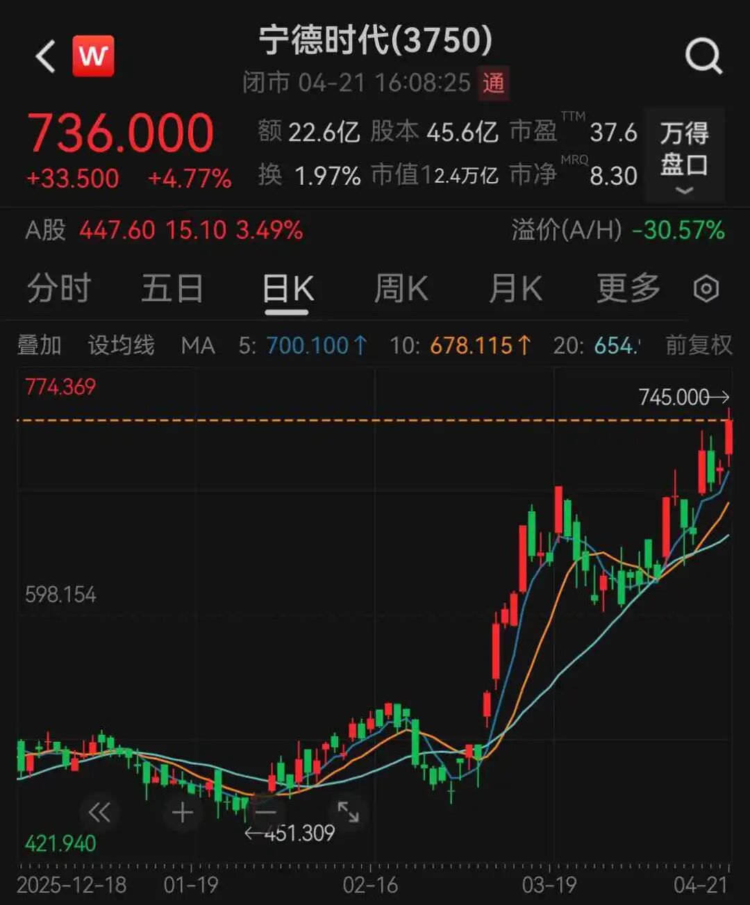 宁德时代今日 股价 强势上扬,收涨4.77%,盘中创历史新高。