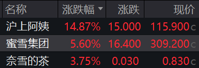 茶饮股普涨,沪上阿姨涨超14%,蜜雪集团涨超5%,奈雪的茶涨超3%。