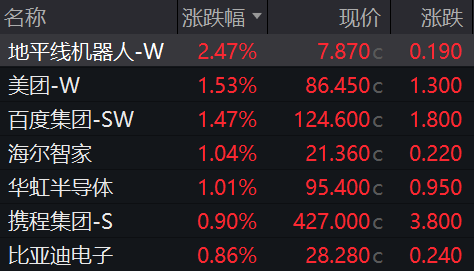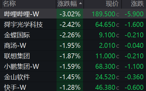 科网股走势分化,地平线机器人涨超2%,百度集团、美团涨超1%;哔哩哔哩跌超3%,商汤、小鹏集团跌超1%。