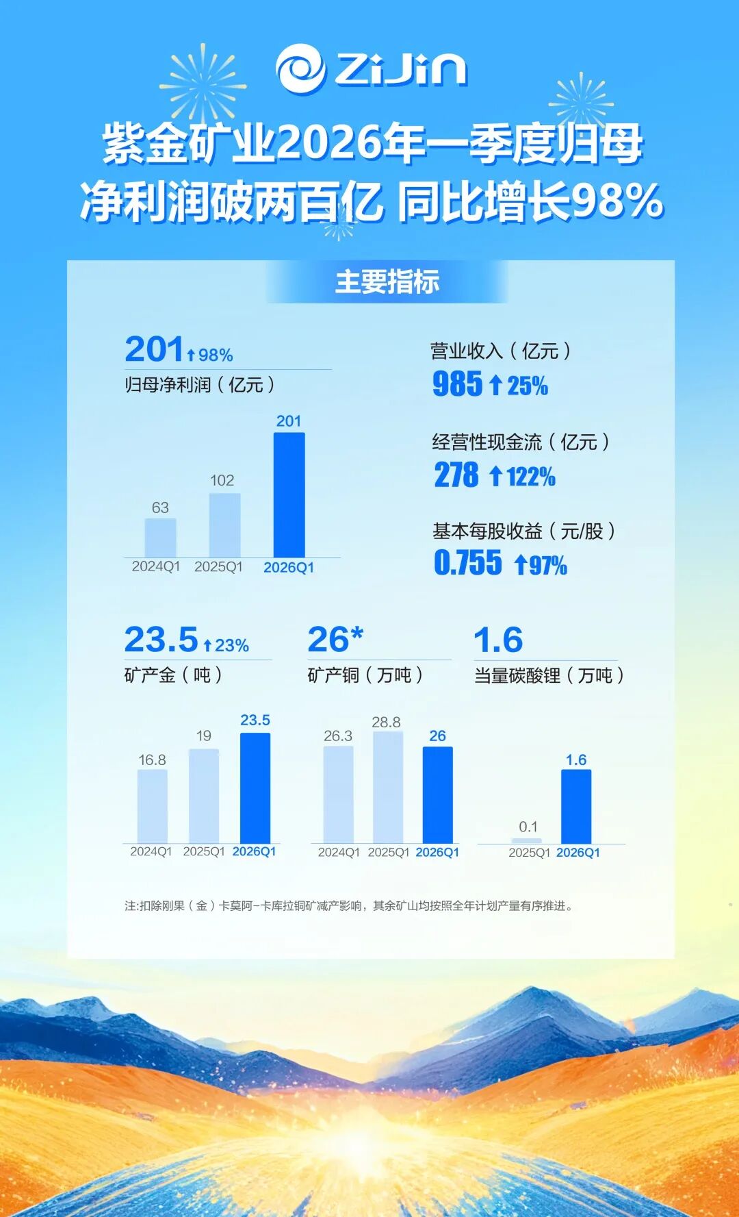 4月21日晚间,紫金矿业董事长邹来昌领衔的紫金矿业新一届管理团队发布履新后的首份成绩单:一季度实现营业收入985亿元,同比增长25%;归母净利润201亿元,同比增长98%;经营活动产生的现金流量净额278亿元,同比增长122%。
