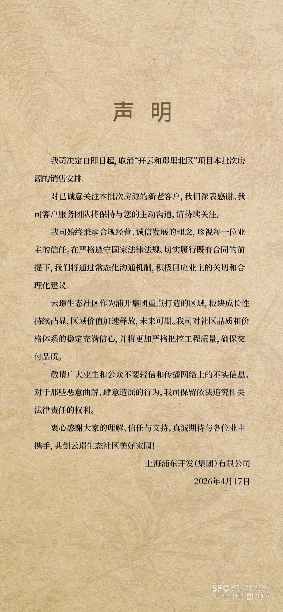 4月17日,上海浦东开发(集团)有限公司(简称“浦开集团”)旗下浦开云璟发布一则声明称,“自即日起,取消‘开云和璟里北区’项目本批次房源的销售安排。对已诚意关注本批次房源的新老客户,我们深表感谢。我司客户服务团队将保持与您的主动沟通,请持续关注。”