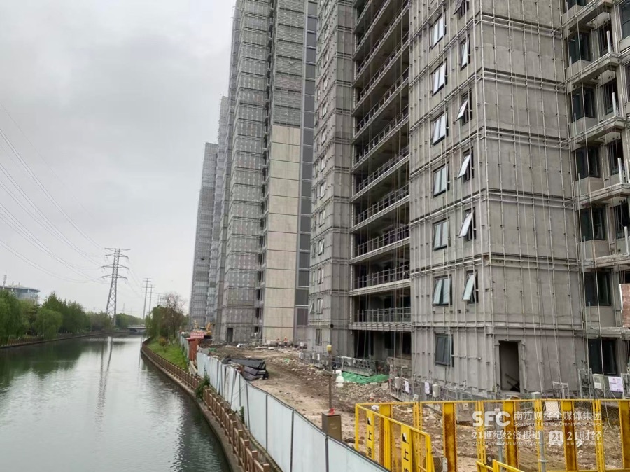 记者在四期项目工地看到,四期南里、北里两个小区以一条道路为界,可以看作是两个独立组团。北里紧挨一条城市内河,河对岸有一排高压线。目前北里正加紧安装外立面铝板及阳台玻璃等。北里工地的施工铭牌显示,“张家浜楔形绿地C2c-04地块住宅项目”开工日期为2023年8月28日,竣工日期为2026年9月29日。