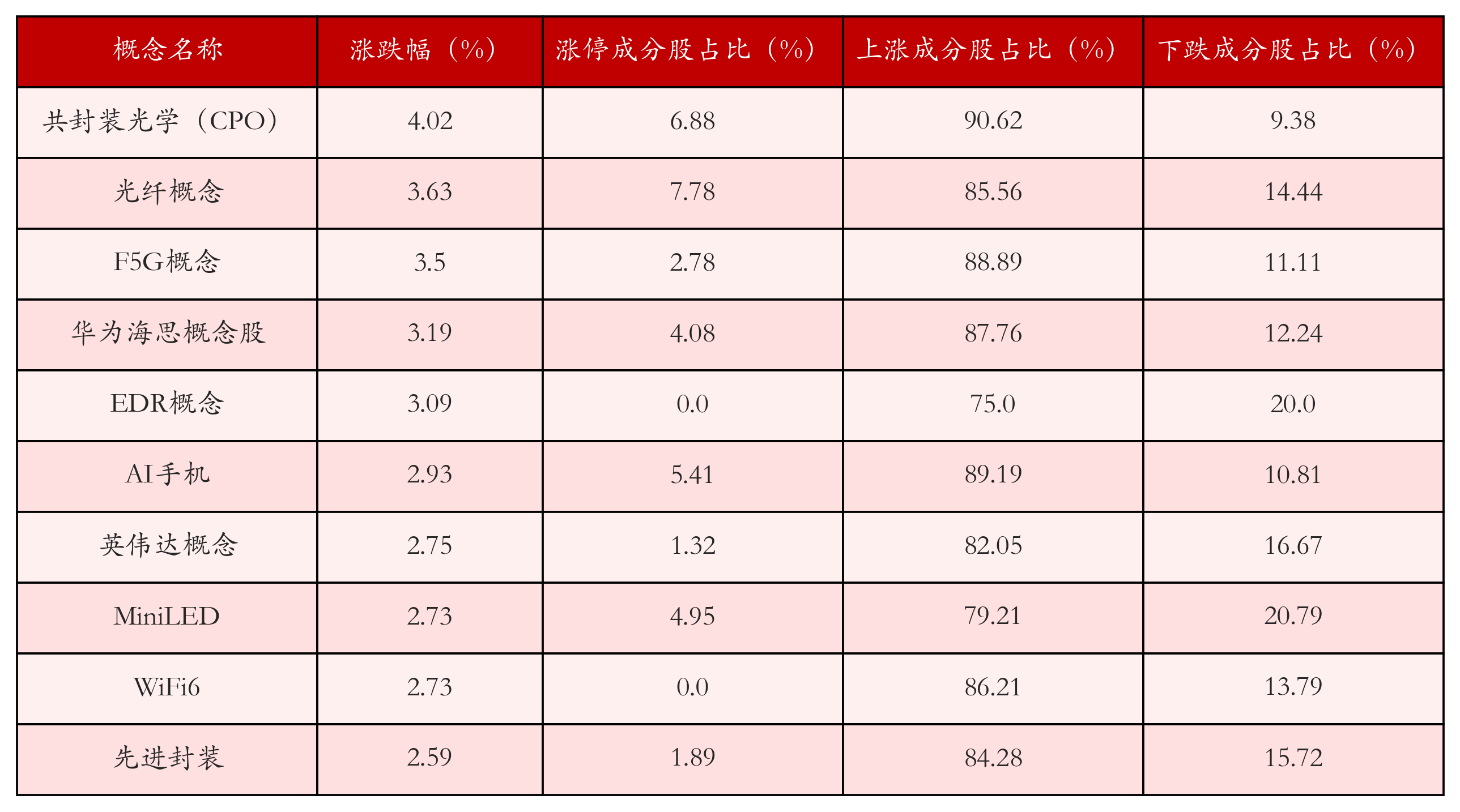 根据A股概念涨跌幅与所对应的股票池综合分析,涨幅靠前的三个概念板块分别为:共封装光学(CPO)、光纤概念与F5G概念。排名前10位的概念板块相关数据见下表: