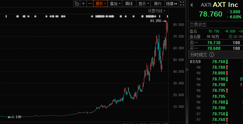 值得注意的是,磷化铟相关概念股股价大幅上涨,美股磷化铟龙头AXT从2025年4月下旬以来,股价累计涨幅超过60倍。美股 光芯片龙头 Lumentum 从2025年4月下旬以来 涨幅也超过16倍, 其在3月宣布将新建一座6英寸磷化铟光学器件晶圆厂。