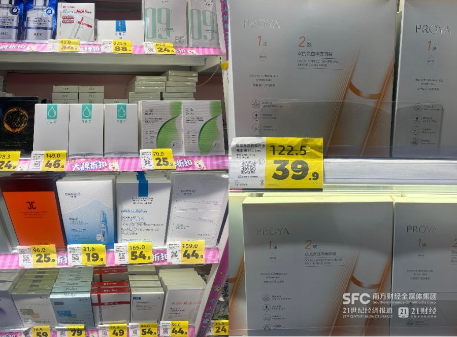 近日,21世纪经济报道记者走访发现,珀莱雅(603605.SH)、贝泰妮(300957.SZ)旗下薇诺娜、华熙生物(688363.SH)旗下夸迪、巨子生物(02367.HK)旗下可复美、上海家化(600315.SH)旗下玉泽、敷尔佳(301371.SZ)、福瑞达(600223.SH)旗下颐莲、林清轩、自然堂等美妆品牌,均有产品入驻好特卖、嗨特购等线下连锁折扣店,且这些产品多数被陈列在门店入口处,被视作引流密码。