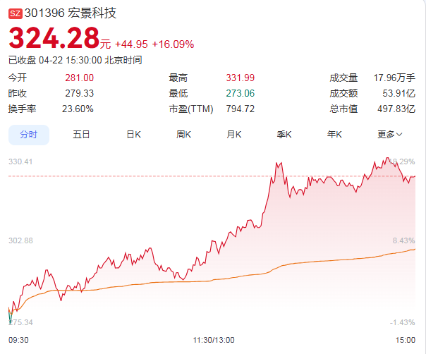 4月22日,宏景科技股价强势大涨16.09%,收盘价为324.28元,总市值攀升至497.83亿元。值得一提的是,自2025年11月24日以来的99个交易日内,宏景科技股价累计涨幅超452%,表现非常亮眼。