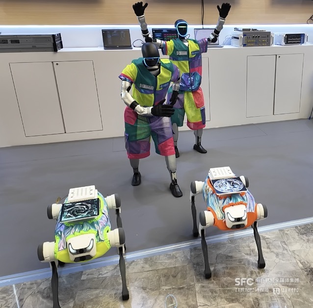 大会现场,2台人形机器人、2台机器狗秀出群舞。表演伊始,两台人形机器人率先举起双臂欢呼。紧接着,其中一台人形机器人优雅地做出“请”的邀请起舞姿态。仿佛听懂了默契的暗号,两只机器狗随之灵动响应,它们踏着节拍,一个接一个地跃动、起跳——不同构型的机器人通过6G网络实现精准的时序配合,完成了一组充满科技感与节奏感的跨界群舞。