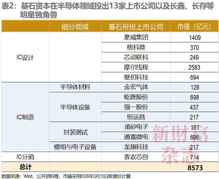 据《新财富》杂志不完全统计,截至2026年 3月15日,基石资本在重点布局的AI、半导体、智慧汽车与机器人、商业航天、生命科学与健康等几大赛道上,合计投出了57家上市公司,它们的总市值达到2.1万亿元。再加上长鑫科技、长江存储、智元机器人、立景创新、歌尔微、蓝箭航天等知名独角兽,基石资本的被投企业朋友圈估值接近4万亿元。