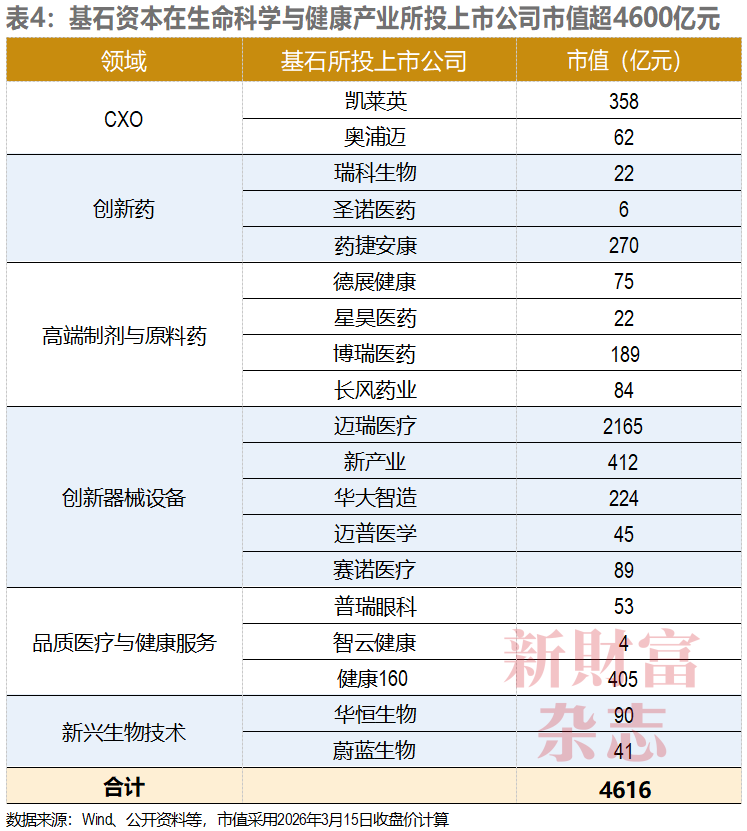 在生命科学与健康产业,基石资本投资了19家上市公司,板块市值达4616亿元,包括2165亿元市值、从美股私有化回归A股时进入的迈瑞医疗(300760),也包括412亿元市值的新产业(300832)、358亿元的凯莱英(002821)、 270亿元的药捷安康(02617.HK)、224亿元的华大智造(688114)等(表4)。
