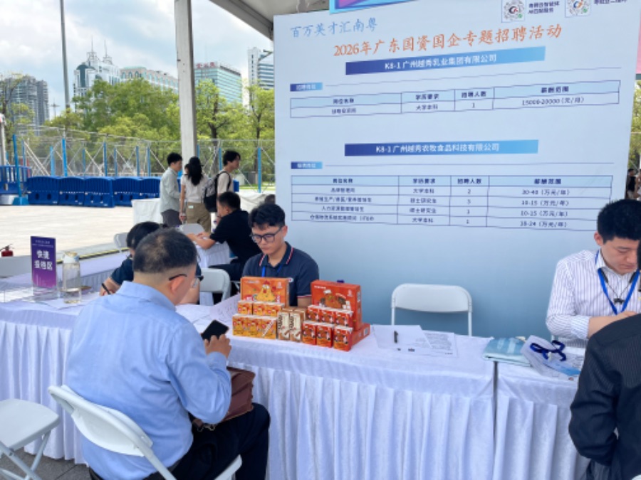 在招聘区上,多家企业HR面试时旁边还摆放着自家产品。比如,越秀集团及旗下企业的展位上就带来了爆款单品姜葱鸡牛奶。据风行乳业工作人员告诉南方财经记者,该产品的推出本意是希望推广岭南风味的本地区域性乳品,其爆火程度也超出预期,展现了“广货行天下”的无限想象力。“我们的团队也很年轻,全员90后,公司也很鼓励我们创新,接下来还会开发更多广府特色口味。”