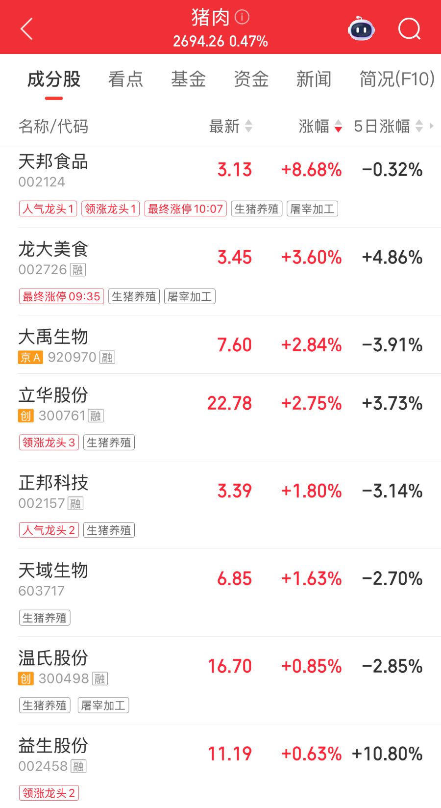 4月22日早盘,猪肉板块强势拉涨,随后回落。截至10:11,天邦食品涨超8%,温氏股份涨0.85%,牧原股份由红转绿。